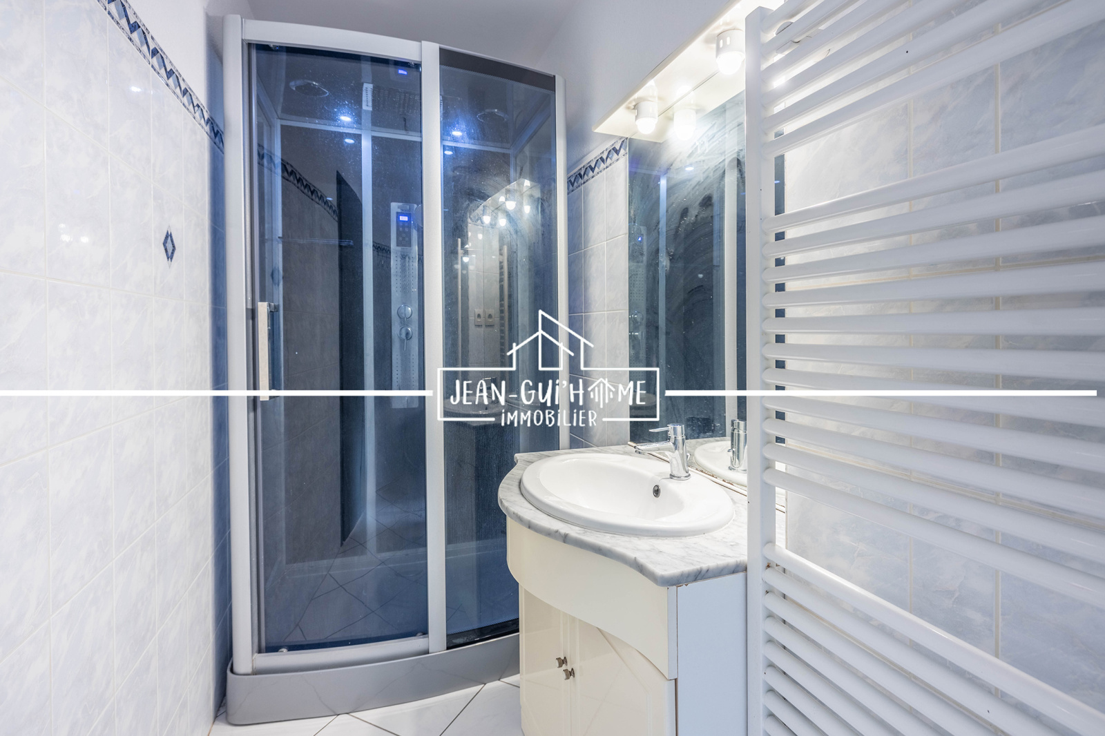 Pour la suite de la visite, une salle de bains avec douche (cabine), une cuisine ouverte sur le salon-séjour avec un accès direct sur la terrasse.