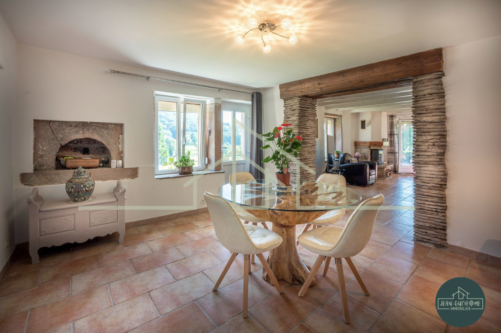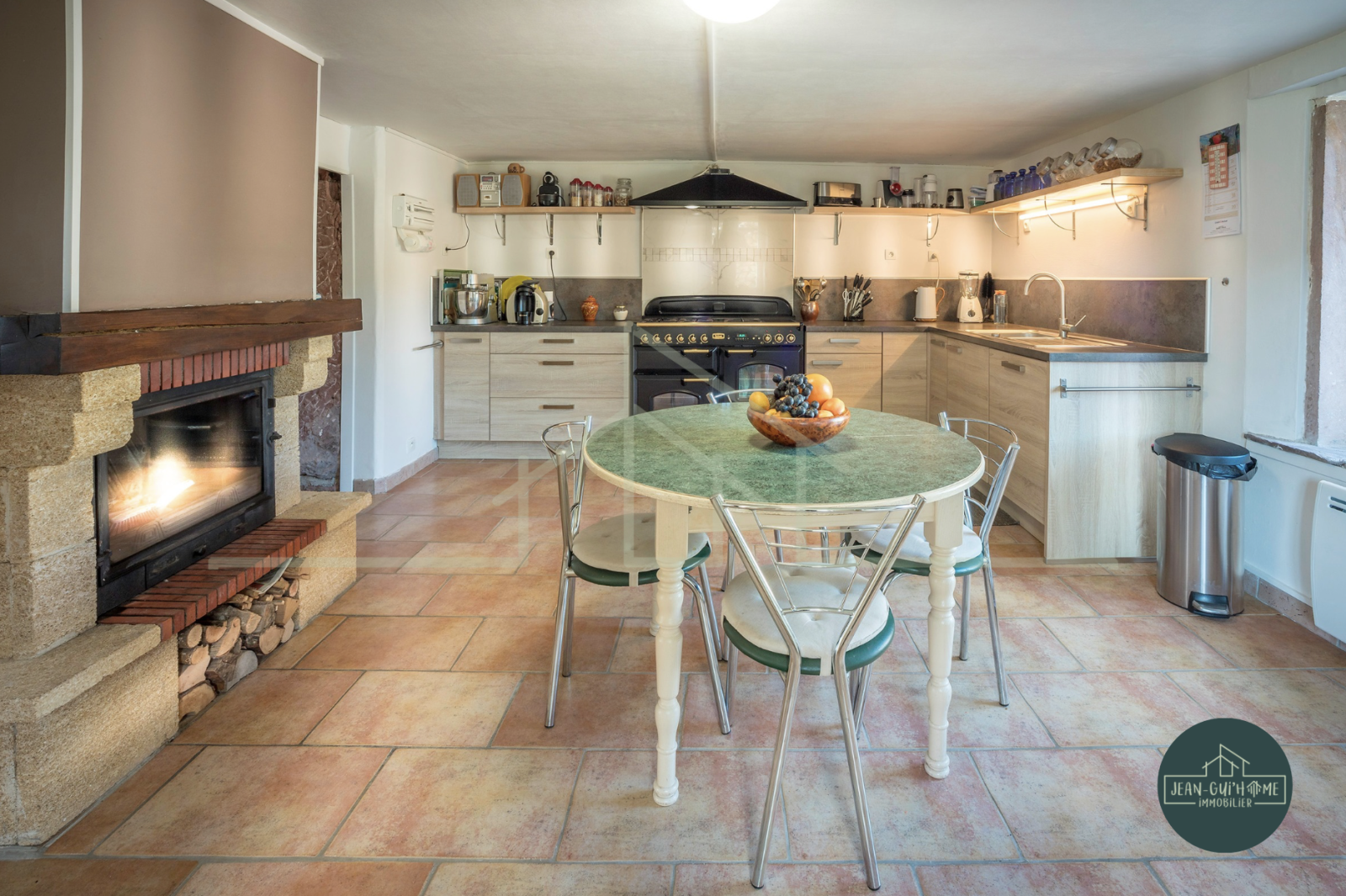 La maison est composée au rez-de-chaussée d'un grand garage, d'un atelier, d'un local pour le bois d'une entrée avec WC séparés, d'une salle à manger avec pierres de four à pain et pierre à eau ancienne, d'une cuisine équipée moderne avec cheminée traversante dans la salle à manger, d'un salon avec une autre cheminée.